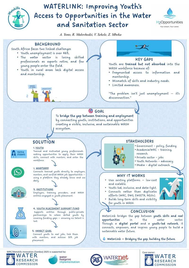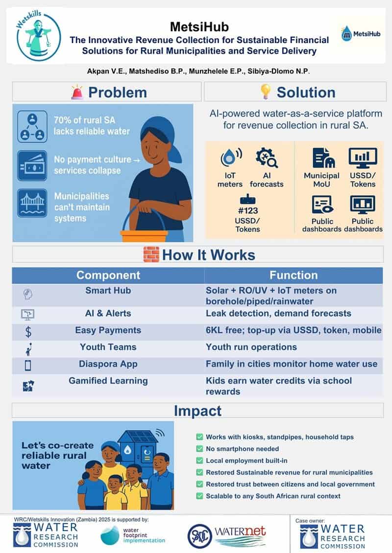 The program starts with a virtual pre-workshop phase, organised by the Wetskills Foundation and the Water Research Commission, comprising of four weekly training and teamwork sessions held every Thursday from 2–23 October 2025, 15:00–17:00 SAST via Microsoft Teams. The sessions will cover team roles, action planning, project management, business development, pitching techniques and technical paper writing. Throughout the virtual phase, supervisors will guide teams as they refine collaboration and validate a concrete, ready-to-pitch solution for their assigned case study.