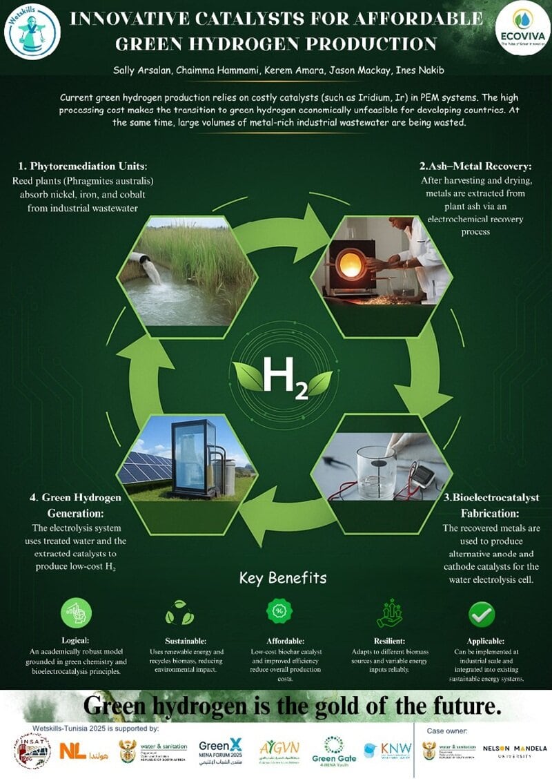 Green hydrogen is a clean fuel with the potential to significantly reduce CO2 emissions, but its production through water electrolysis is costly due to expensive catalysts like iridium. Research is exploring more affordable alternatives by combining iridium with cheaper metals such as ruthenium, titanium, and gold. Using innovative synthesis methods, these new catalysts are designed to maintain performance while lowering costs. Advanced characterisation techniques evaluate their efficiency, durability, and suitability for integration into electrolysers. The ultimate goal is to create a practical, cost-effective green hydrogen production system that combines sustainable technology with renewable energy. This approach could make hydrogen more accessible, supporting the transition to cleaner energy and promoting sustainable industrial development globally.