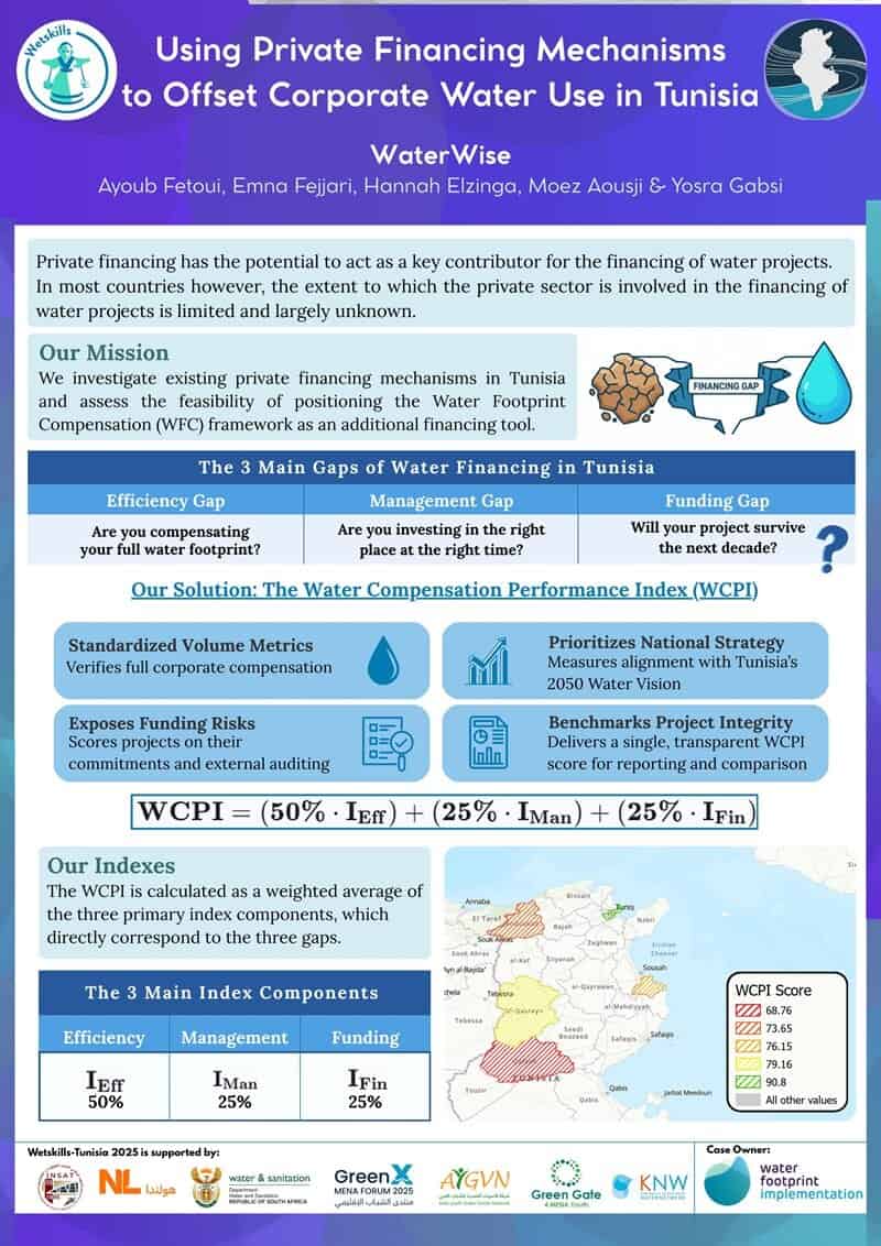 Private financing has the potential to act as a key contributor for the financing of water projects. In most countries however, the extent to which the private sector is involved in the financing of water projects is limited and largely unknown. This case explores existing private financing mechanisms for water projects in Tunisia and evaluates their effectiveness in mobilizing investments for water projects. How can Water Footprint Implementation strategically introduce the Water Footprint Compensation framework to stimulate sustainable, transparent, and scalable private-sector participation and so contributing to both water security and responsible water management?